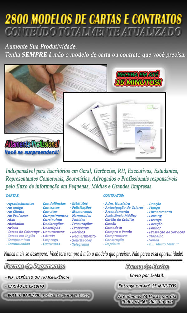 Tenha sempre à mão, o modelo de carta ou contrato que você precisa. Kit completo.
